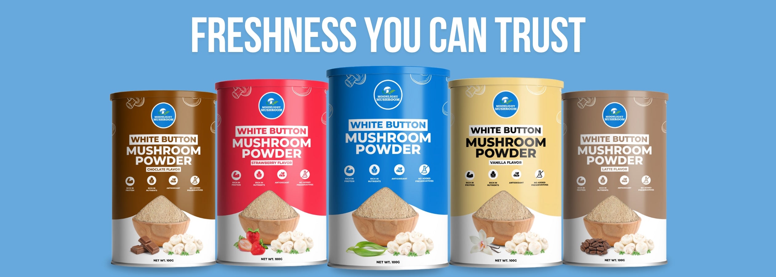 Healthy living just got tastier! Explore Moonlight Mushroom’s flavoured powders – Chocolate, Latte, Strawberry, and Vanilla – where natural superfood nutrition meets delicious flavors. Perfect for kids and adults.