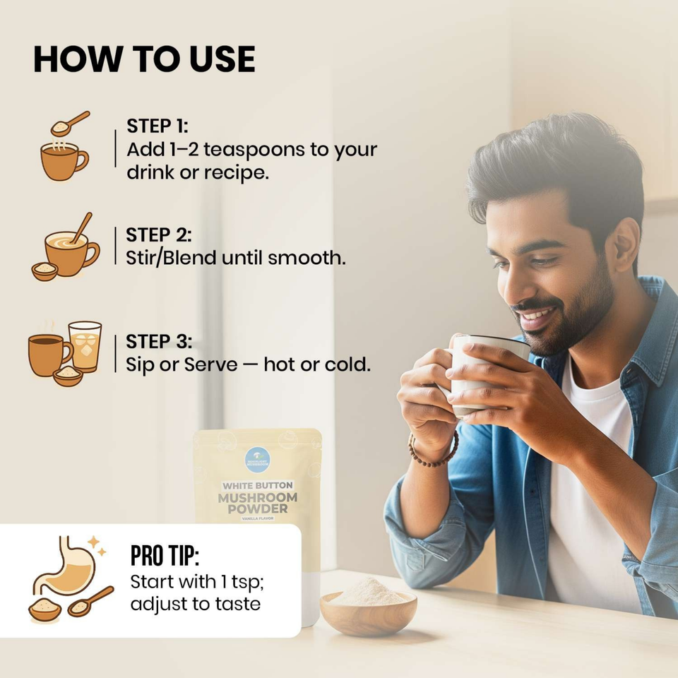 Moonlight Mushroom introduces the Vanilla Flavoured White Button Mushroom Powder, a smooth and nutritious superfood blend. Enriched with protein, antioxidants, and essential nutrients, this delicious powder combines the natural goodness of mushrooms with the classic taste of vanilla.